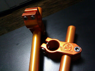 I have been working working working. Trying to finish Anya’s bike. I got the custom Clip ons in. They were so fucking orange, NOT GOLD. So i used oven cleaner and stipped the anodizing off of them and slapped them on.