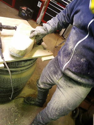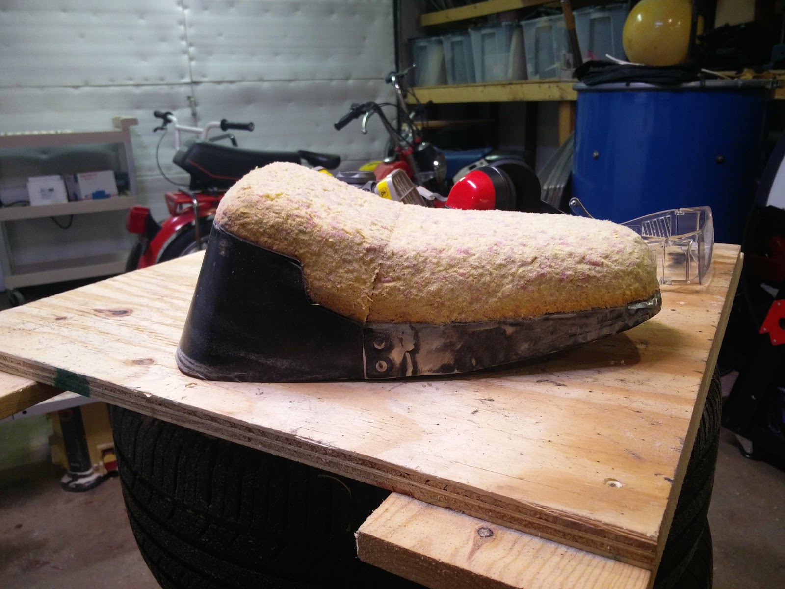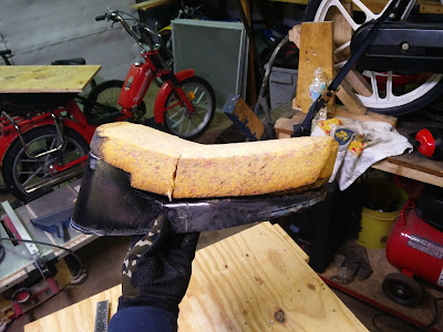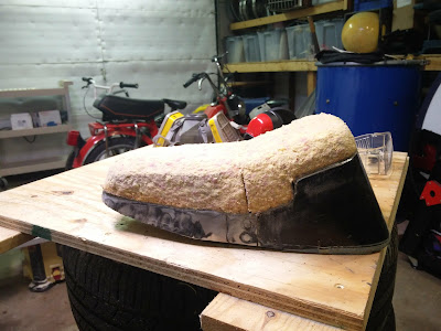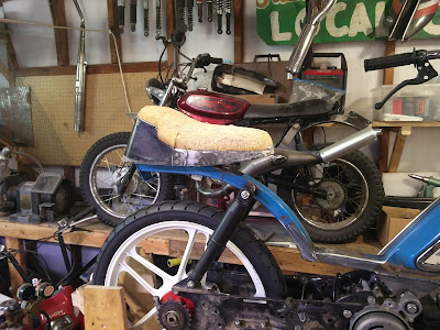 Working on the seat. I am using a stock hobbit seat that I have cut a about 1.5inches out of the center. I also reshaped the foam with a flap disc. I also used to stock hobbit rear seat mount but welded in a center piece to connect to the frame.