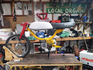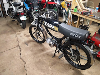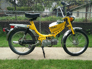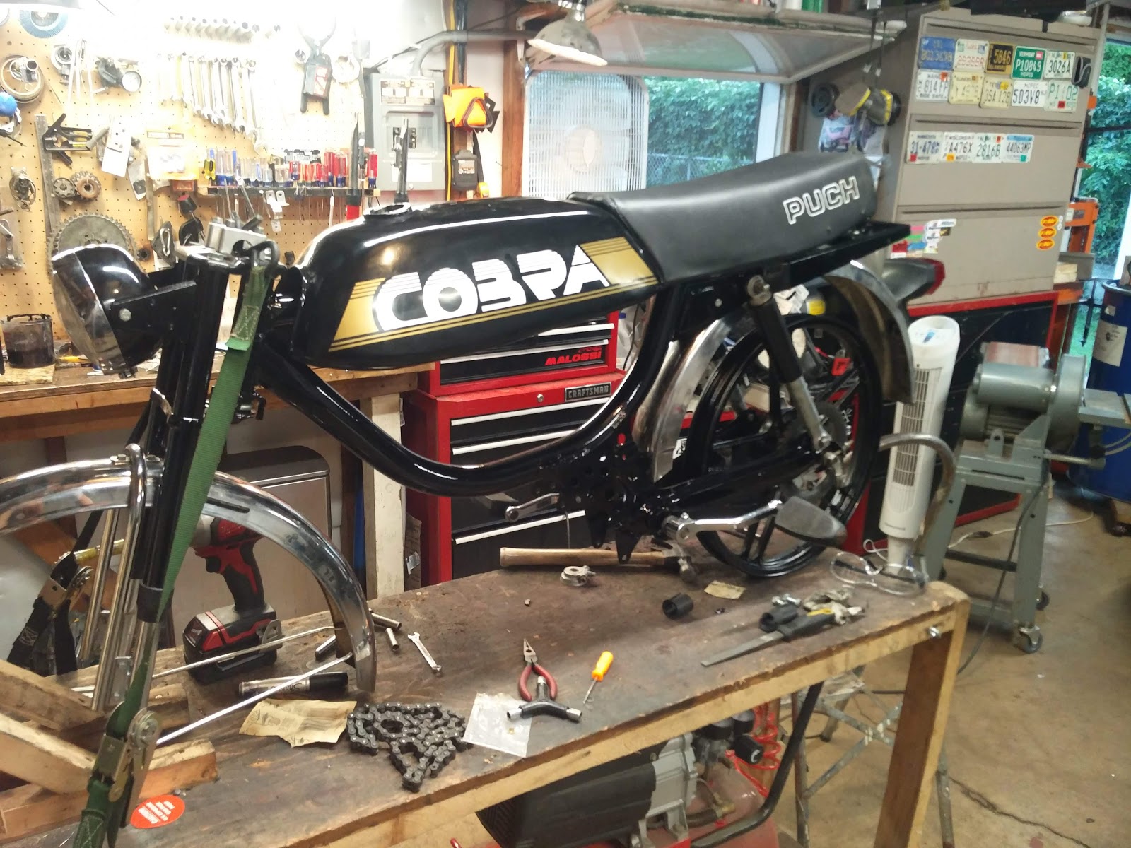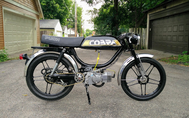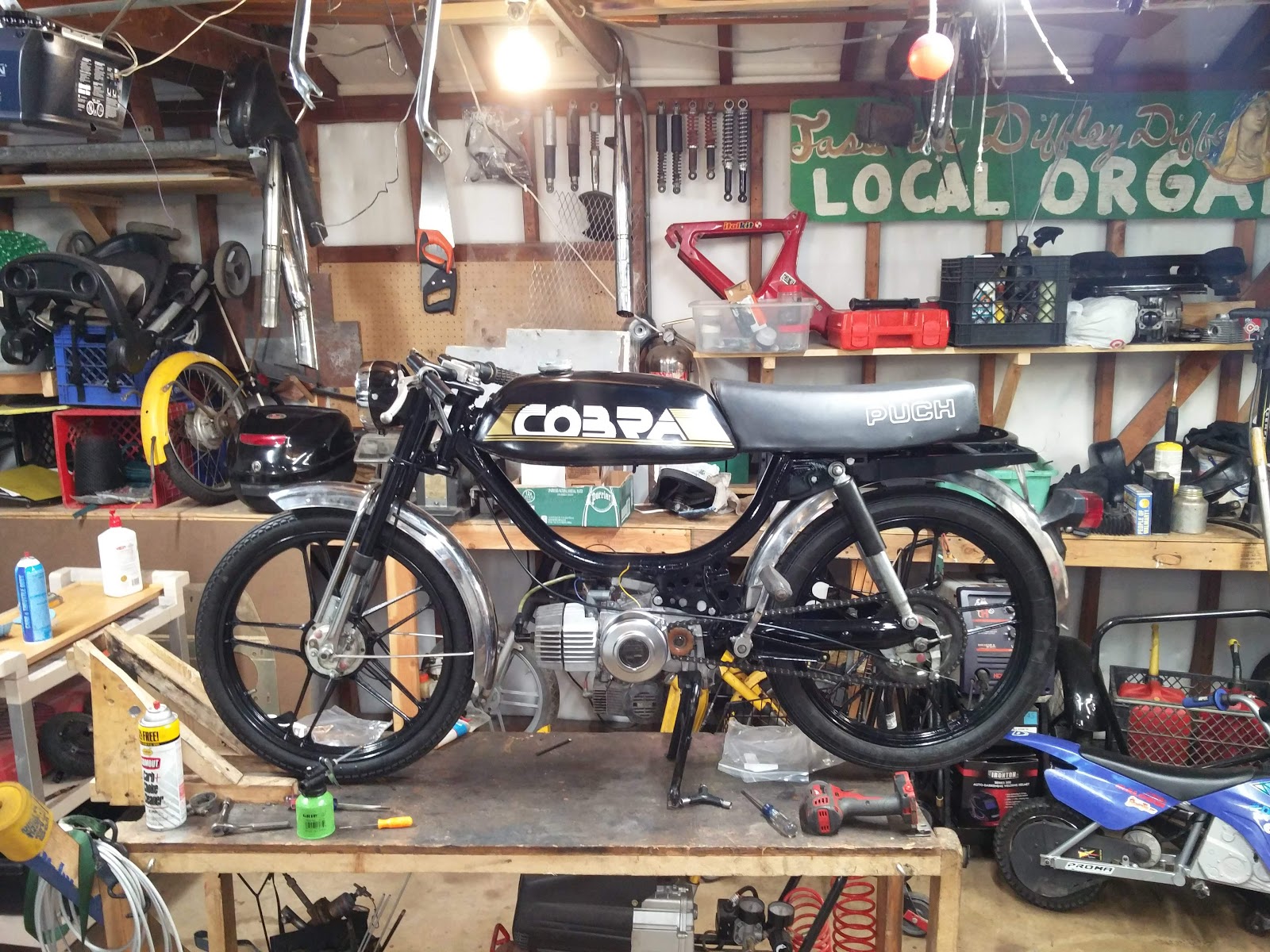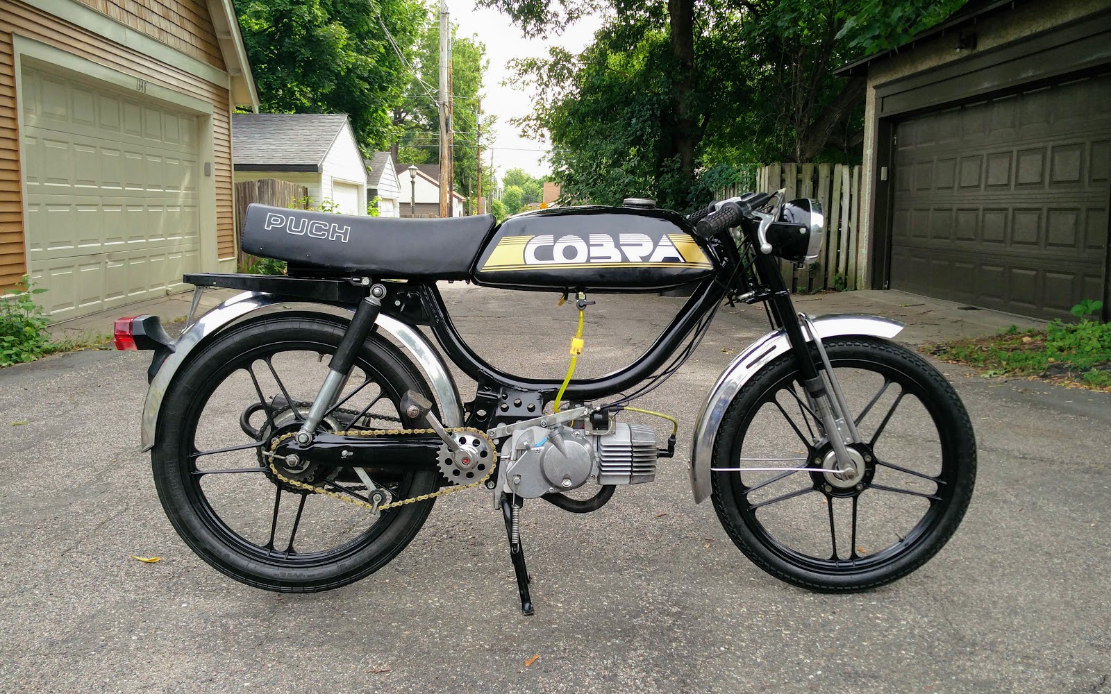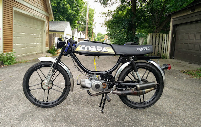 I picked up a Puch Pinto a while ago. Right after I got it, Dos got in replica Cobra tanks so I figured why not. I got a seat from a Puch Condor that fits up pretty good. On to it.