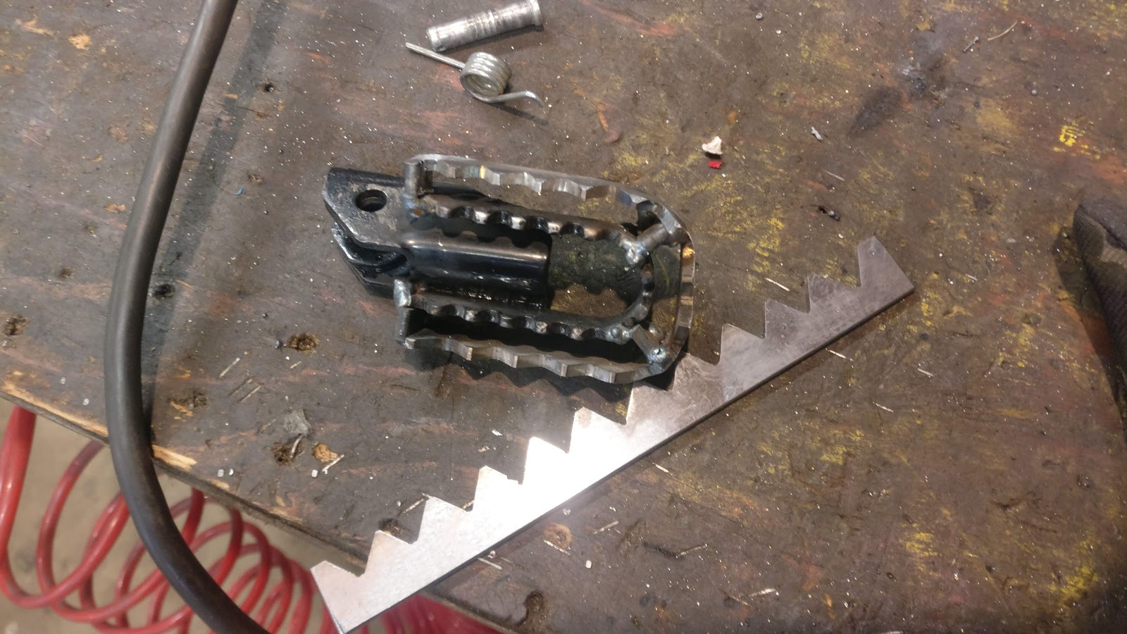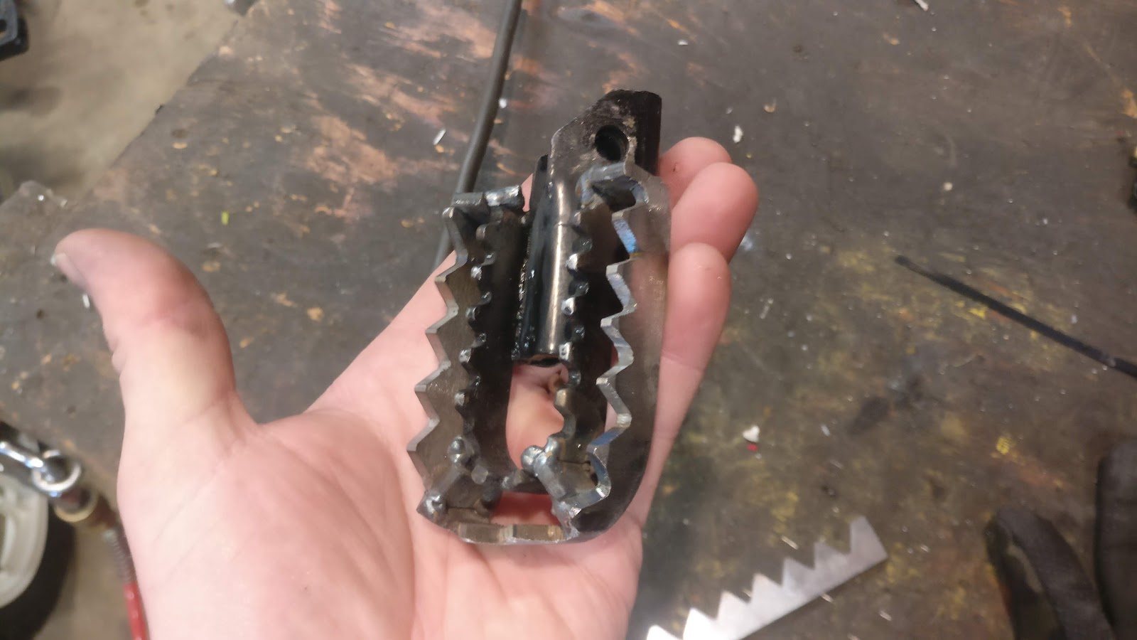 Made some new wider foot pegs for the JR80 by cutting some steel strips and welding them onto the original foot pegs. They are great!