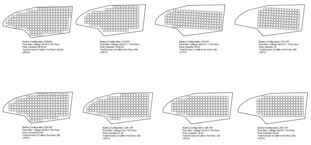 Ok I got the bike all wired up and even running on the stand. I used a 72V lawn mower battery just to test it and it works great. Now I need to figure out the battery. I made a cardboard template of a battery. Then I measured it and scaled it in auto cad and made a grid of batteries. I am not quite sure if I want to go 21s (88V) or 20s (84v). I am asking for some advice in some groups before I figure out what battery pack ill go with.